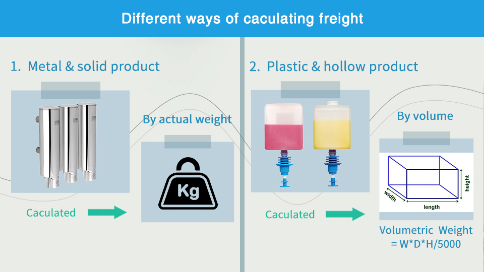 2.if it is plastic or hollow product, such as plasic soap dispenser, bottle, paper dispenser,should be cacualted by volumetri weight,the formula is width times height times depth divided 5000/6000