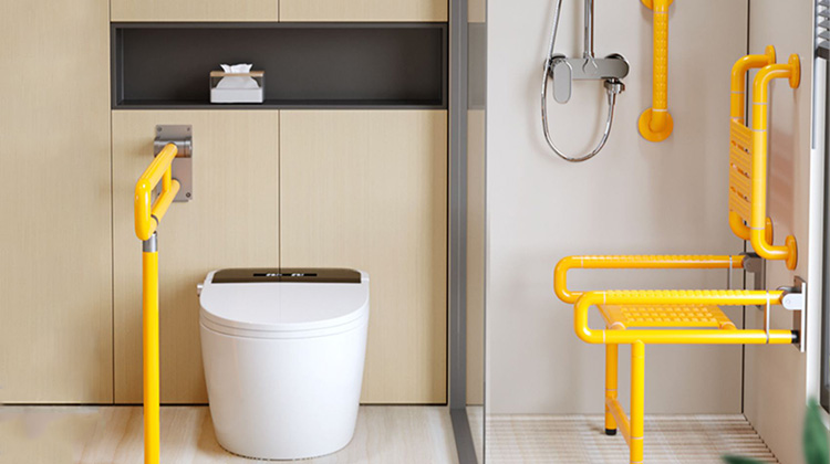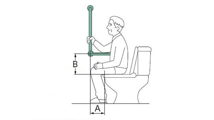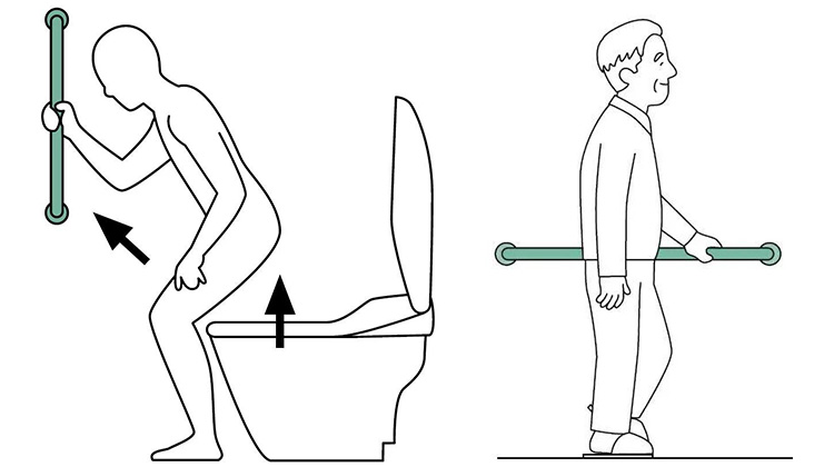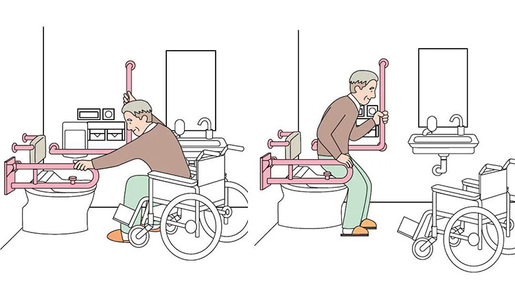 以坐便器旁竖向扶手为例。当使用者需要起身时,拉住竖向扶手的同时身体会前倾,借助扶手的拉力,从而使臀部更易于抬起,进而辅助使用者完成站立的动作。在需要水平移动或保持姿势的地方,需使用横向扶手。