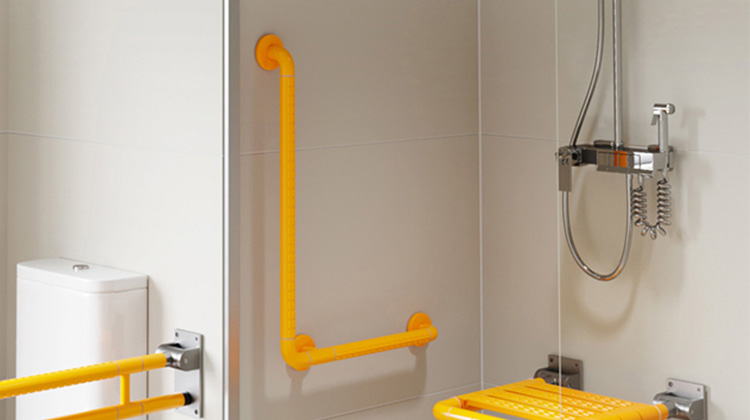L型扶手常见于无障碍厕所中,其可同时起到横向及纵向扶手的功能。